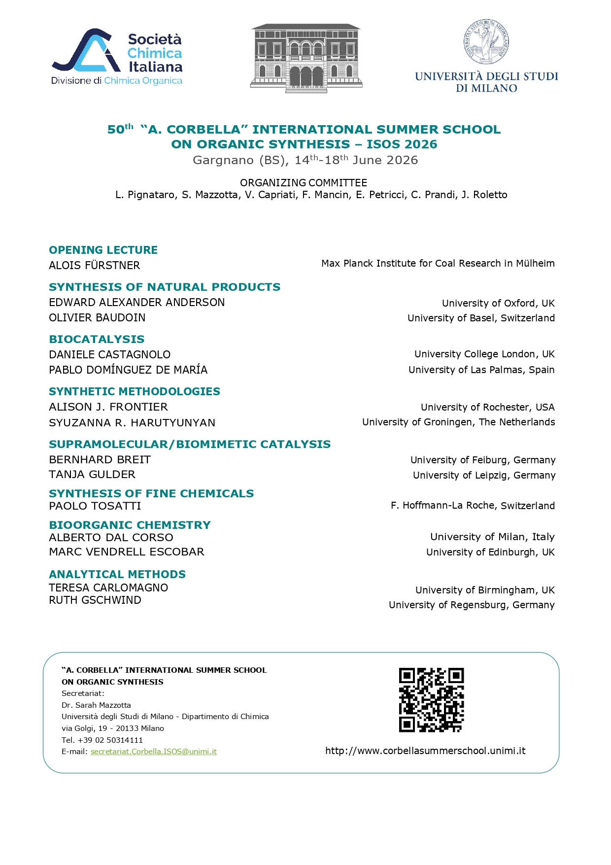 The XLIX edition of the "Attilio Corbella" International Summer School on Organic Synthesis (ISOS 2026) will take place in Gargnano (BS, Italy) from 14 to 18 June 2026.